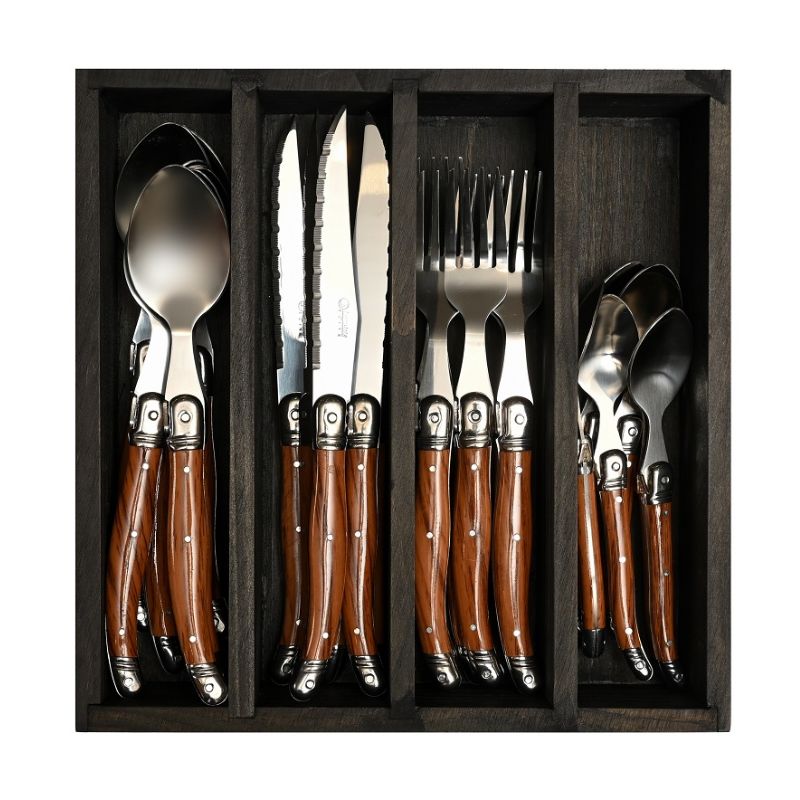 Handcrafted cutlery from France presented in a wooden compartment box with a certificate of authentication