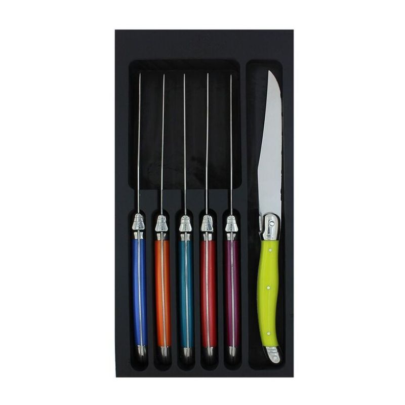 Set includes six pieces, serrated table knife made of hardened stainless steel and sturdy riveted handles