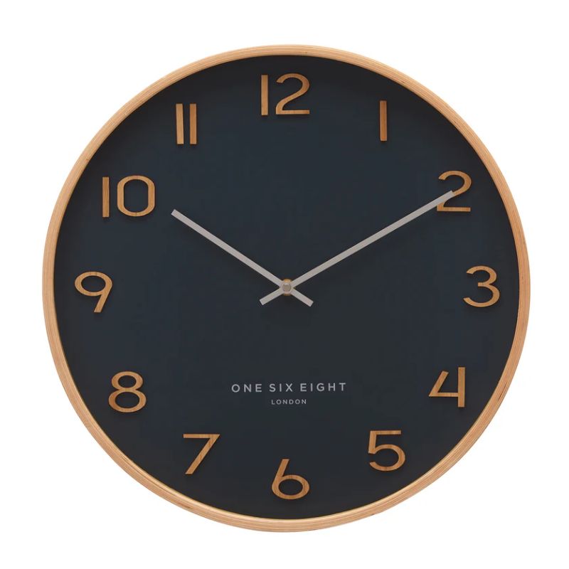 Olivia Wall Clock by One Six Eight London features bold Arabic numerals, striking brushed chrome hands. The Olivia also has a lovely plywood case and a glass lens. The safe option that is sure to suit all homes and offices.