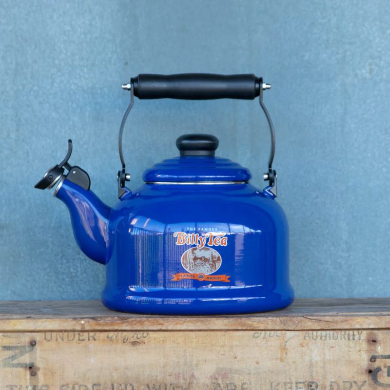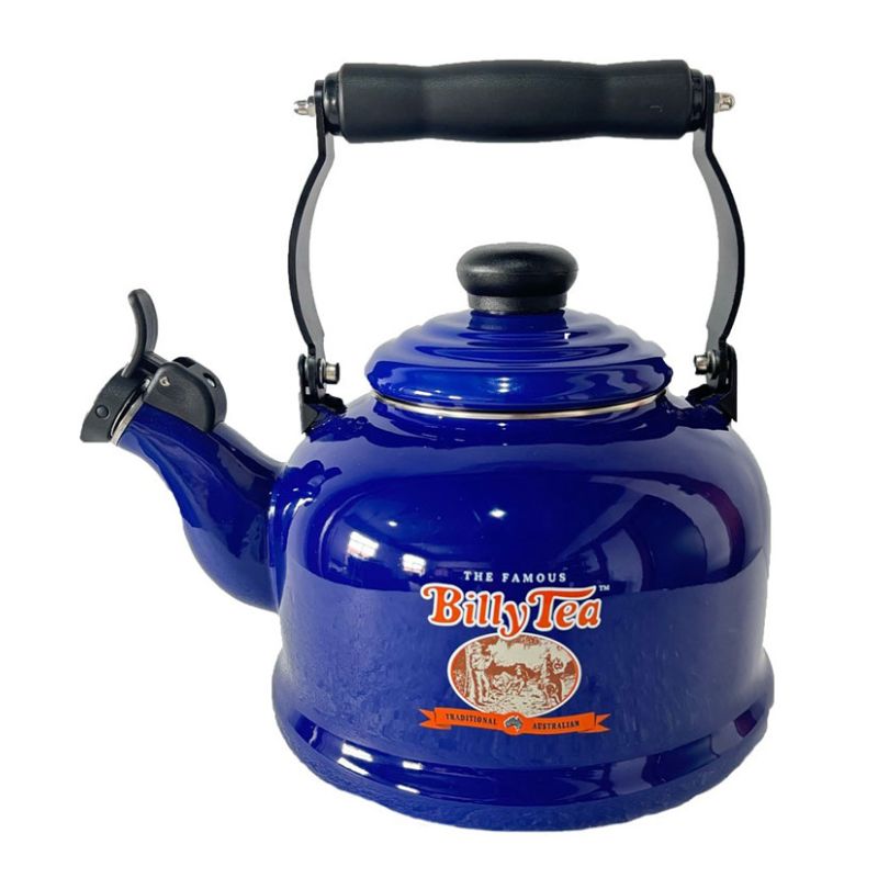 Celebrate the taste of Australia with this Enamel Whistling Kettle emblazoned with the Billy Tea Logo complete with trademark. It’s a reminder of how refreshing it is for stop for a cuppa and a biscuit or two.