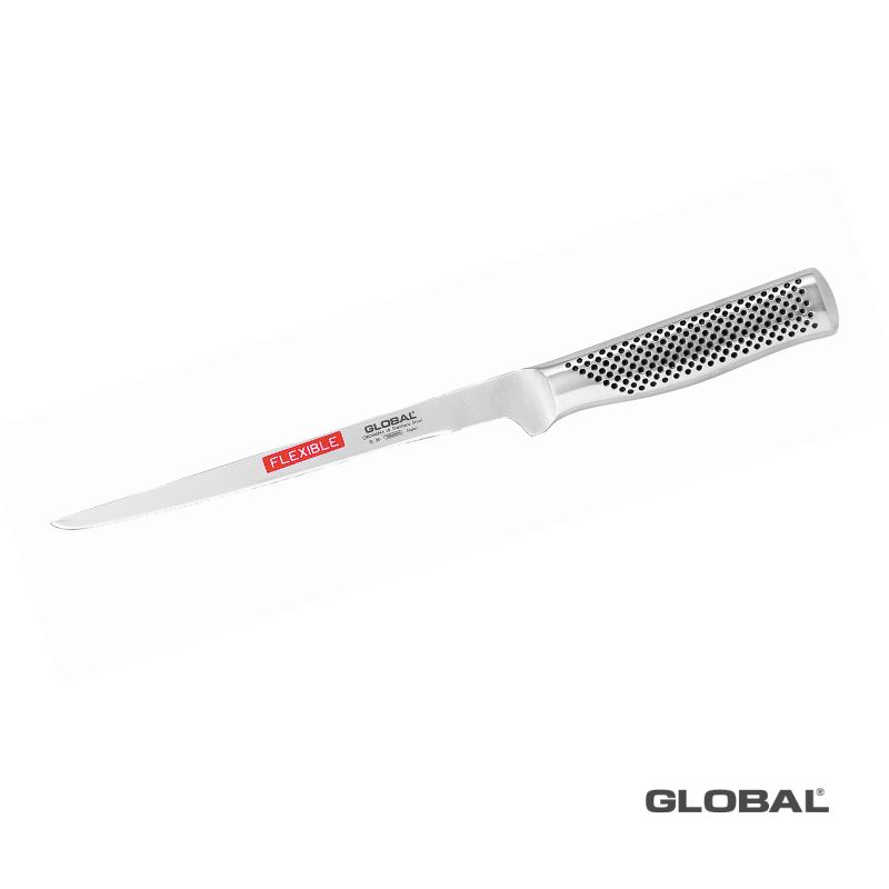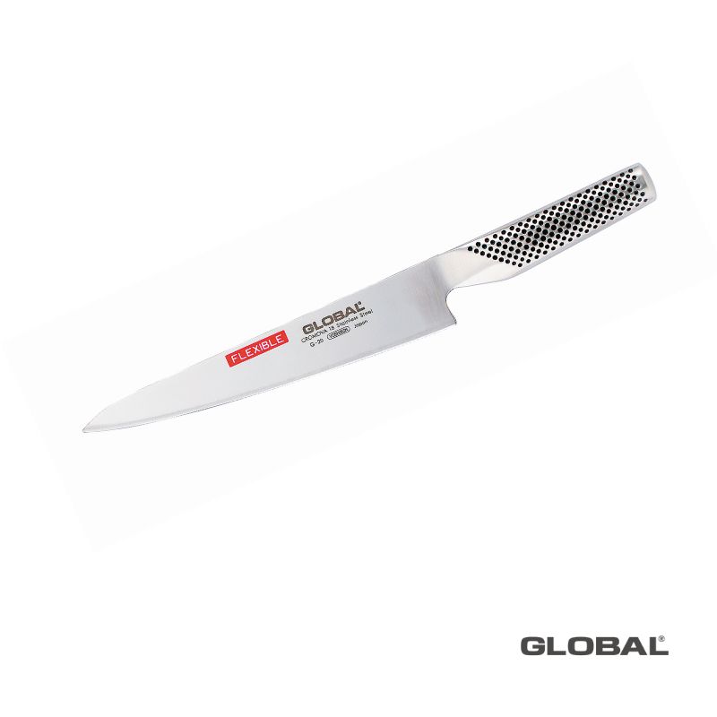 The G-2 is made from CROMOVA 18 stainless steel, specially developed by GLOBAL as it holds a razor-sharp edge and resists rust, stains and corrosion. Ice tempered and hardened to Rockwell C56-58, each knife is carefully weighted by filling the handles with sand to achieve the optimum weight and perfect balance. Other unique features include its smooth contours and seamless construction which eliminates food and dirt traps offering the ultimate in safety and hygiene. The acute 15-degree angle cutting edge provides unsurpassed performance and superior edge retention.