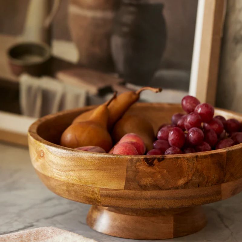 Add warmth and natural beauty to your table with Mango Wood Pedestal Platter. Crafted from rich mango wood, this elevated platter is perfect for serving fresh fruit, pastries, or cheese boards while creating height and interest on your table. Its timeless, versatile design makes it ideal for everyday dining, grazing boards, or relaxed entertaining.