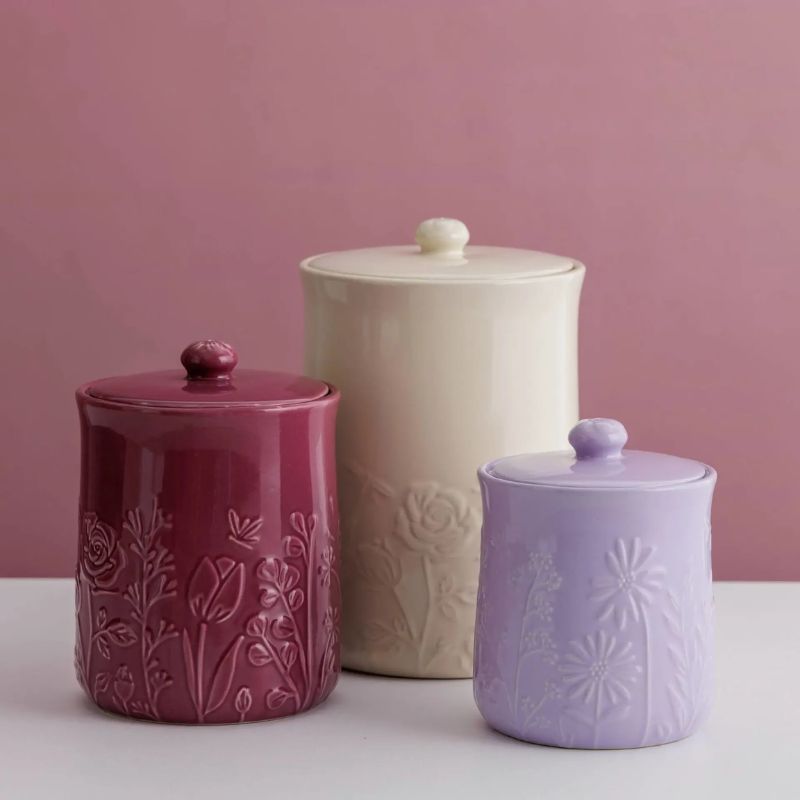 The Mason Cash In the Meadow collection is intricately embossed with delicate florals and foliage, with a beautiful colour palette. A perfect addition to any kitchen. The storage jar features a classic design which will suit any kitchen. The storage is practical and will keep the kitchen worktop organised. Made from stoneware, the storage is hard-wearing and durable making it perfect for everyday use. The 800ml capacity is ideal for storing your biscuits, cookies, rice or flour whilst the airtight lid will keep contents fresher for longer. Mason Cash was established in the heart of the English ceramic industry back in 1800 and has become world renowned for its innovative, classic kitchenware today.
