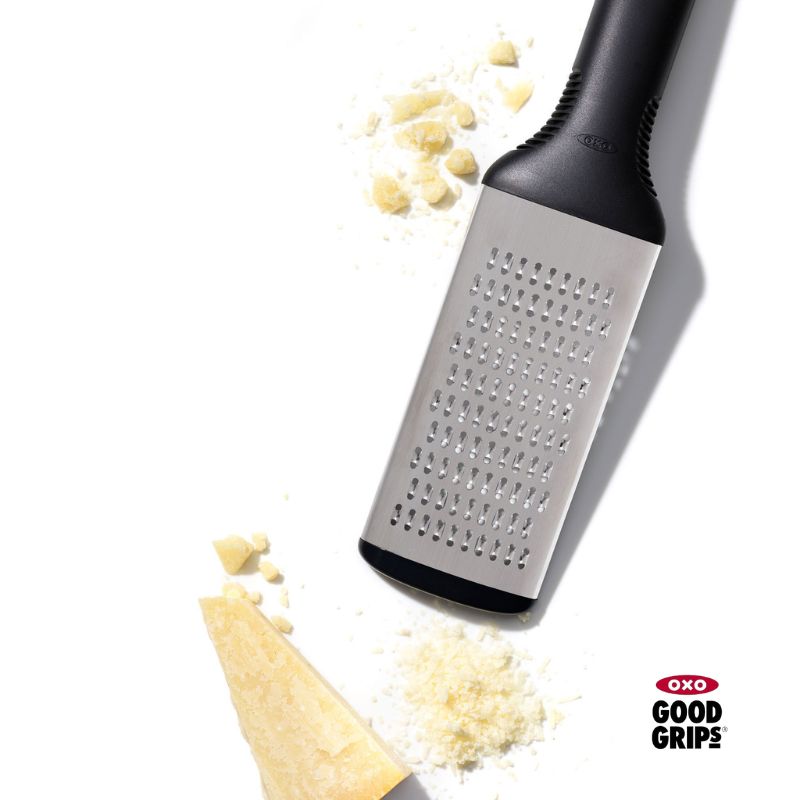 The OXO Good Grips Grater is an essential tool for hard cheese, chocolate, carrots, zucchini and more. The Grater’s bi-directional stainless steel surface helps you tackle any grating task quickly and easily, while its soft, comfortable, non-slip handle provides a secure grip and cushions your hand during repetitive use. A non-slip foot keeps the Grater steady on any surface when in use, and the Grater is dishwasher safe for easy cleaning.