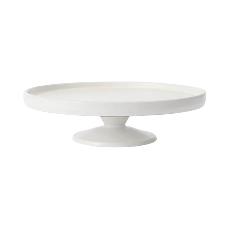 White ceramic cake stand with embossed provincial style trailing leaf border and matte finish.