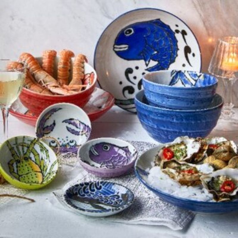 A fun and eclectic design featuring seafood motifs of lobster, fish, blow fish and crabs in a pad print technique interior with a hand painted exterior