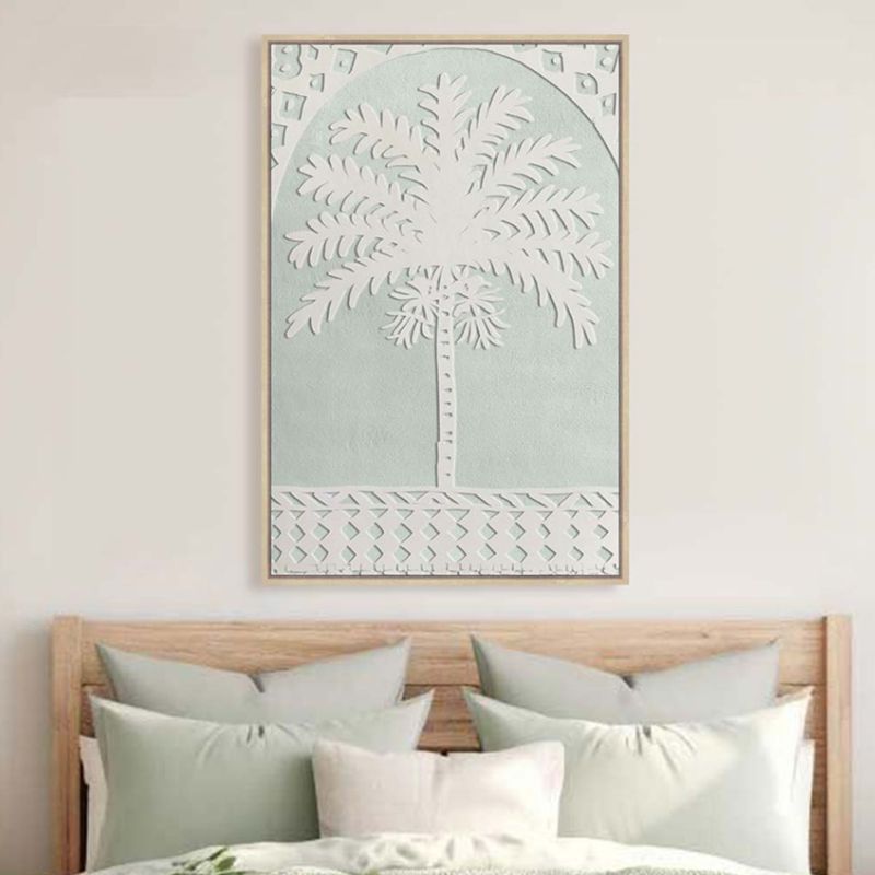Elevate your interior design with our exquisite 3D Palm Painted Canvas. Featuring a stunning palm tree set against a delicate aqua background, this artwork captures a feeling of serenity and sophistication, making it a perfect statement piece for any space.